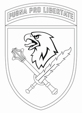 Неважко помітити, що різниця між емблемами 7-го та 8-го корпусів мінімальна. По суті, є лише три відмінності. Перша – це срібна голова орла замість крила. Друга – меч та пернач мають дещо менші розміри. Третя – декоративно-інформаційна стрічка над щитом. На стрічці напис латиною “PUGNA PRO LIBERTATE” (“Бій за волю”). Колір щита й стрічки все той же “червоний (маруновий)”, канти та літери напису – срібні. Стрічка доповнює лише повнокольорову версію емблеми – на приглушеній її немає. Хоча в описі про це не говориться, дзьоб і райдужка ока орла золоті, язик – червоний. Зауважимо, що на затвердженому малюнку емблеми 8-го корпусу золотий колір має інший, світліший відтінок. Тлумачення пернача, меча й орлиної голови – таке ж, як в описі емблеми 7-го корпусу. Не зайвим буде також сказати, що голова орла виглядає вельми “по-американськи”.