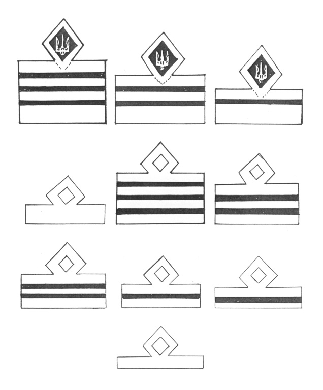 На стор. 6 альбому було зображено нарукавні знаки військових звань офіцерів та адміралів, помилково названі “нарукавними шевронами”[13]. Згідно з описом вони мали виготовлятися з металевого галуна золотистого кольору шириною 28, 12 та 8 мм і носитися на тужурках із зовнішньої сторони рукавів на відстані 50 мм від зрізу. Так, молодшому лейтенанту належав один середній галун з петлею з такого ж галуна, нашитою у верхній частині посередині. Петля мала вигляд ромба зі стороною 40 мм У лейтенанта під галуном з петлею розміщувався вузький галун без петлі, у старшого лейтенанта – середній галун, у капітан-лейтенанта – один вузький і один середній. Капітану 3-го рангу належали один середній галун з петлею і два середніх без петлі, капітану 2-го рангу – один середній з петлею і три середніх без петлі. Для капітана 1-го рангу передбачався один широкий галун з петлею, виконаною з середнього галуна. У контр-адмірала, віце-адмірала і адмірала над широким галуном розташовувалися один, два і три середніх галуна відповідно. Верхній середній галун був з петлею у вигляді ромба зі стороною 60 мм. Центр петлі прикрашав Тризуб[14], вишитий металевими нитками золотистого кольору. Довжина галунів становила 120 мм, відстань між ними – 5 мм. Зазначалося, що право носіння нарукавних знаків розповсюджується на плавсклад ВМС.