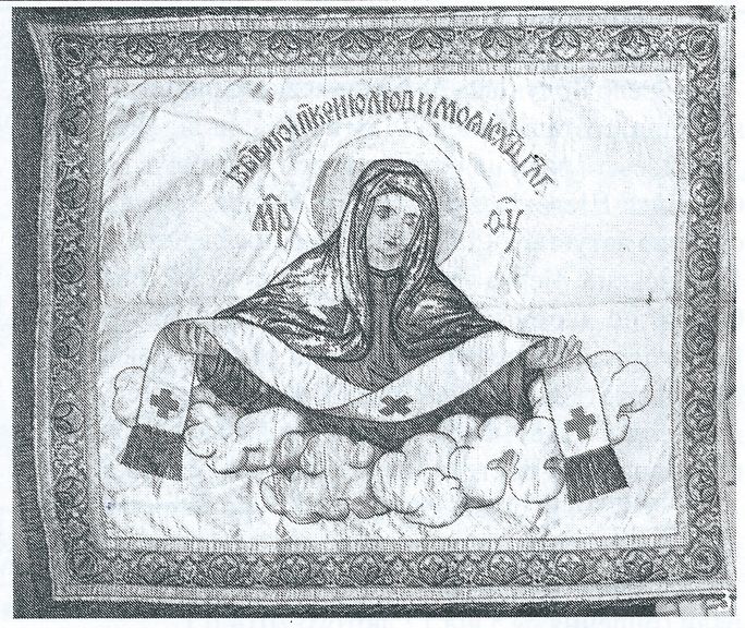 хмар виходить поясна фігура Богородиці у пурпуровому (фіолетовому) мафорії та