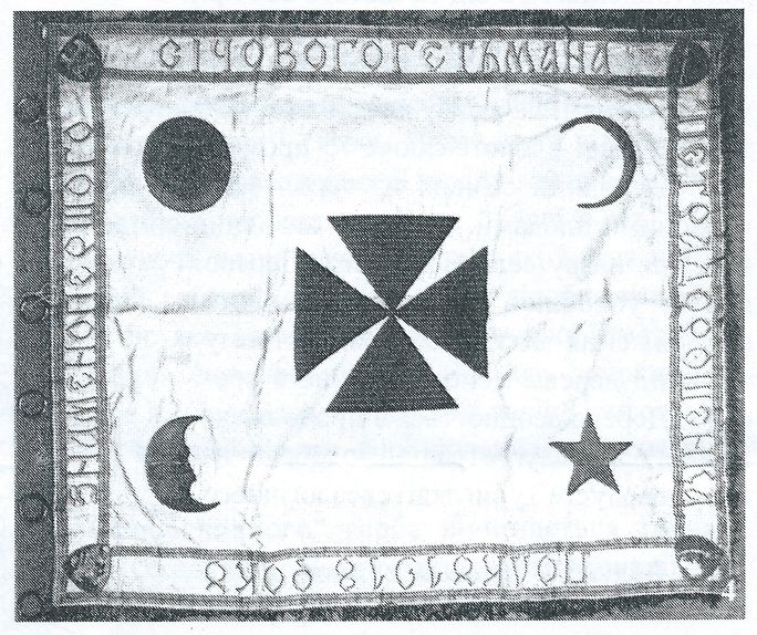 ГЕТЬМАНА ПЕТРА ДОРОШЕНКА ПОЛКУ 1918 РОКУ. По кутах прапора апліковано чотири