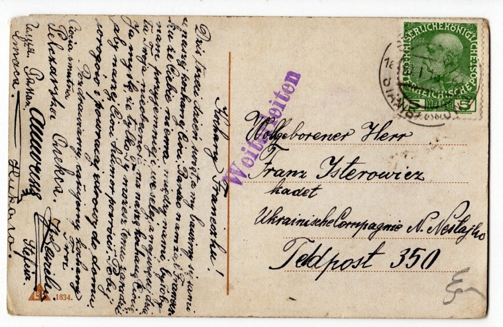 Цікавою поштову картку робила хіба що наявність на звороті австро-угорського штампу міста Станіславів (сучасний Івано-Франківськ) з датою 10.1.1916 та ювілейна марка 1908 року на честь 60-ти річчя правління цісаря Франца-Йосипа, вартістю 5 геллерів (витвір відомого віденського художнина Коломана Мозера). Отже, ця листівка свого часу якимось чином потрапила з Німеччини на територію Австро-Угорщини. Проте, ще на торгах звернув увагy на цікаву деталь: лист (написаний польською мовою, адреса - німецькою) надіслано в янусь «українську poтy». (Ukrainische Compagnie N. Nestajko, до «високоповажного герра Франца Істеровича» (Wollgeborener Неrr Franz Isterowiez). Під рискою було дописано його звання – «кадет» (kadet). У листі повідомлялося[1]: