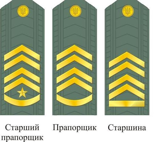 Переймаючи традиції Українського війська часів національно-визвольної боротьби 1917-20 рр., фахівці відділу військової символіки та геральдики запропонували таку систему розрізнення військових звань професійного сержантського складу. Старшому солдату належить один шеврон, молодшому сержанту – два, сержанту – три, старшому сержанту – чотири, старшині – чотири шеврони і прямокутник, прапорщику – чотири шеврони і дуга, старшому прапорщику – чотири шеврони, дуга і зірка. Крім того, згадані вище елементи дозволяють легко коригувати знаки розрізнення у разі введення додаткових сержантських звань, доповнюючи шеврони прямокутниками, дугами чи зірками.
