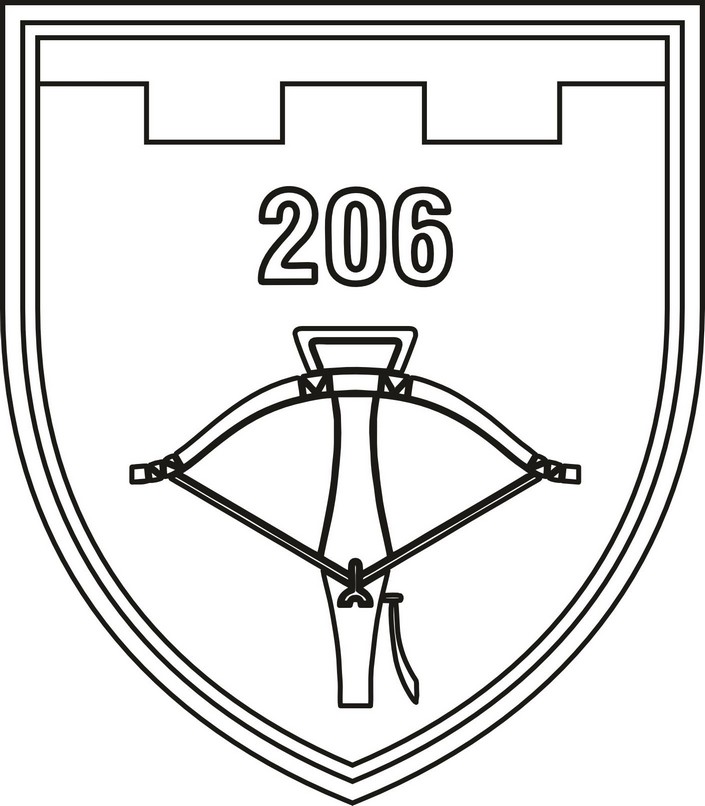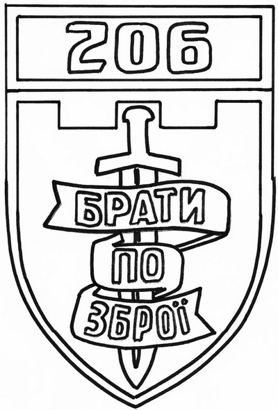 У 206-го окремого батальйону ТрО було декілька варіантів емблеми. Перша мала логотип фонду “Брати по зброї”, який створив колишній президент України П. Порошенко (мал. 9). Але через політичні моменти її змінили. Був варіант, на якому зобразили давній герб міста Києва – на червоному щиті рука, яка тримає кушу. Остаточним варіантом стала емблема, на якій також зображена куша (арбалет) із додаванням номера частини “206” (мал. 10).