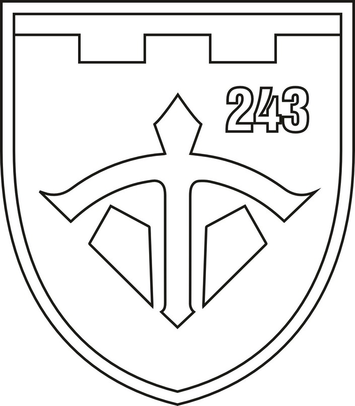 243-й окремий батальйон ТрО спочатку мав емблему, на якій була зображена тваринка, яка тримає в лапах натягнутий лук зі стрілою з емблеми бригади. Але далі основним варіантом нарукавної емблеми частина став простіший малюнок, де лук зображений вертикально і відсутній номер частини. А виготовлені у ПП “Символіка” емблеми для батальйону отримали й номер частини (мал. 13).