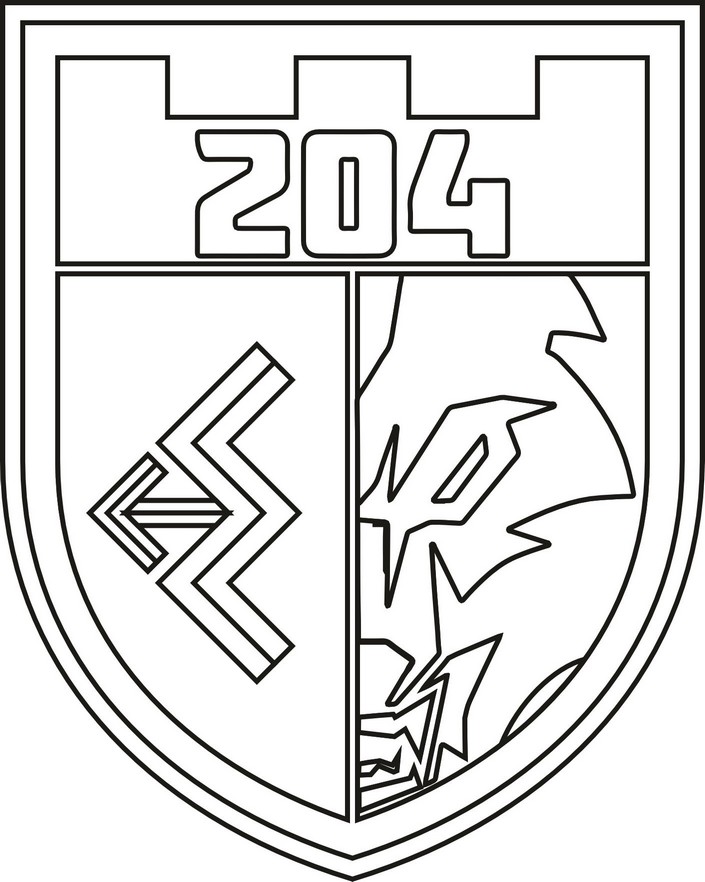 Нарукавна емблема 204-го окремого батальйону ТрО (мал. 6) засвідчила той факт, що він формувався з частини 130-го батальйону. Тому вона отримала як символ 130-го батальйону, так і власний символ у вигляді морди вовка, половина якої зображено на другій частині щита емблеми. Також до неї включили номер частини, який офіційні розробники з Києва ставити не дозволяють, що свідчить про те, що ця (а також інші батальйонні емблеми) офіційно не були затверджені.