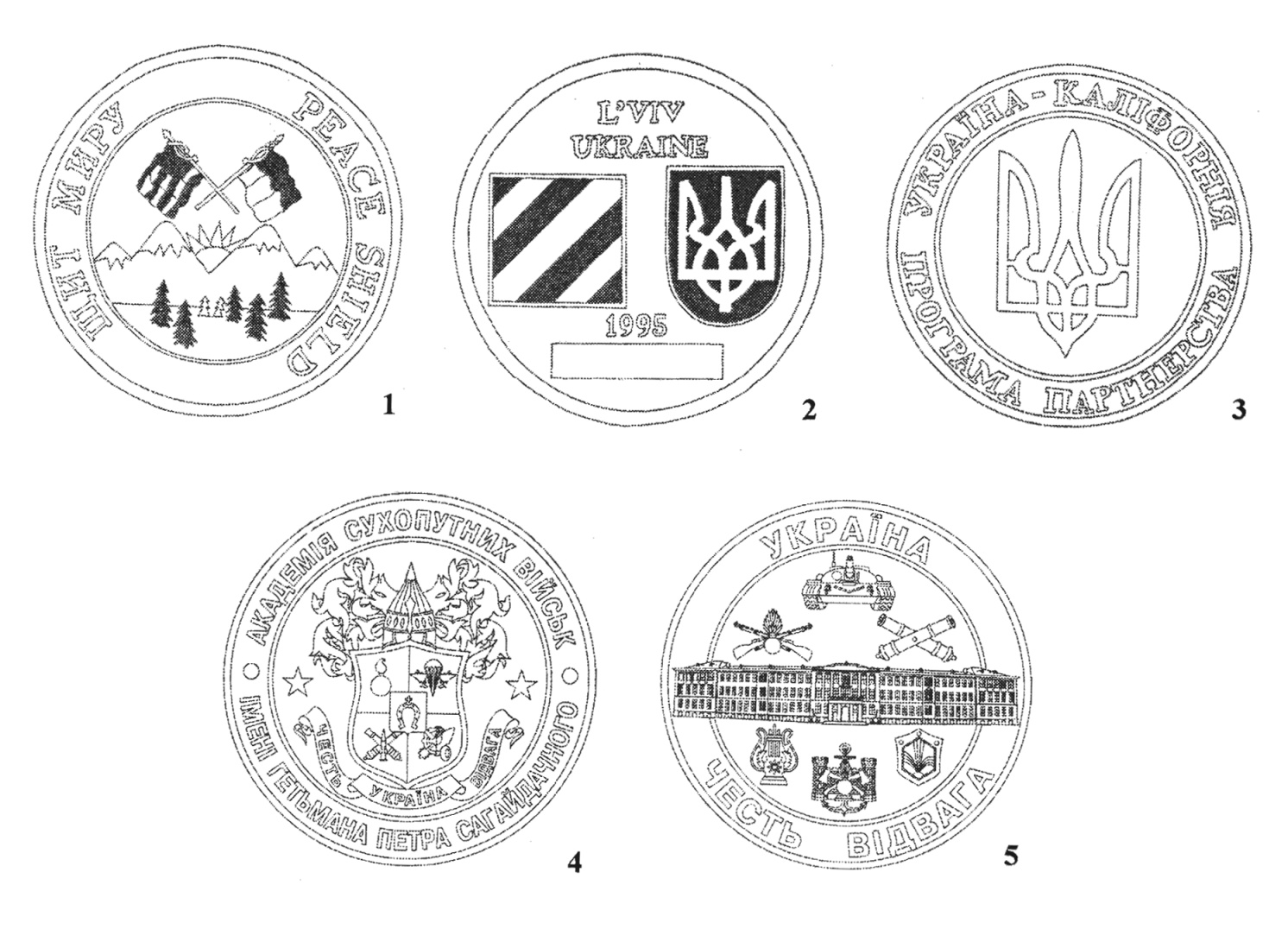 Перше детальне дослідження цього нового для України та її Збройних Сил виду військової фалеристики – так званих “Challenge Coin” – був зроблений полтавським істориком та колекціонером Сергієм Литвином у статті “Новітні тенденції української фалеристики” (“Коллекцион”, № 2, липень 2012 р., С. 9–10.). Тому нема сенсу ще раз нагадувати про ці цікаві військові відзнаки, які з’явились відносно недавно, у роки Другої світової війни в американській армії. Єдине, що можна додати – це уточнити перші зразки цих “Challenge Coin” в Україні (на той час їх ще не можна було назвати виключно українськими). Перша поява цих відзнак пов’язана не з миротворчими контингентами Збройних Сил України, а з проведенням в Україні спільного багатонаціонального навчання “Щит миру” на Яворівському полігоні у 1995 р. Ініціаторами їх виготовлення та авторами дизайну були американські військові. Відзнака (аверс і реверс, мал. 1–2) виготовлялась в США та вручалась під час навчань як американською стороною (офіцерами з керівництва навчань та 3-ї піхотної дивізії), так і українською (представниками Міністерства оборони, Прикарпатського військового округу та 24-ї механізованої дивізії).